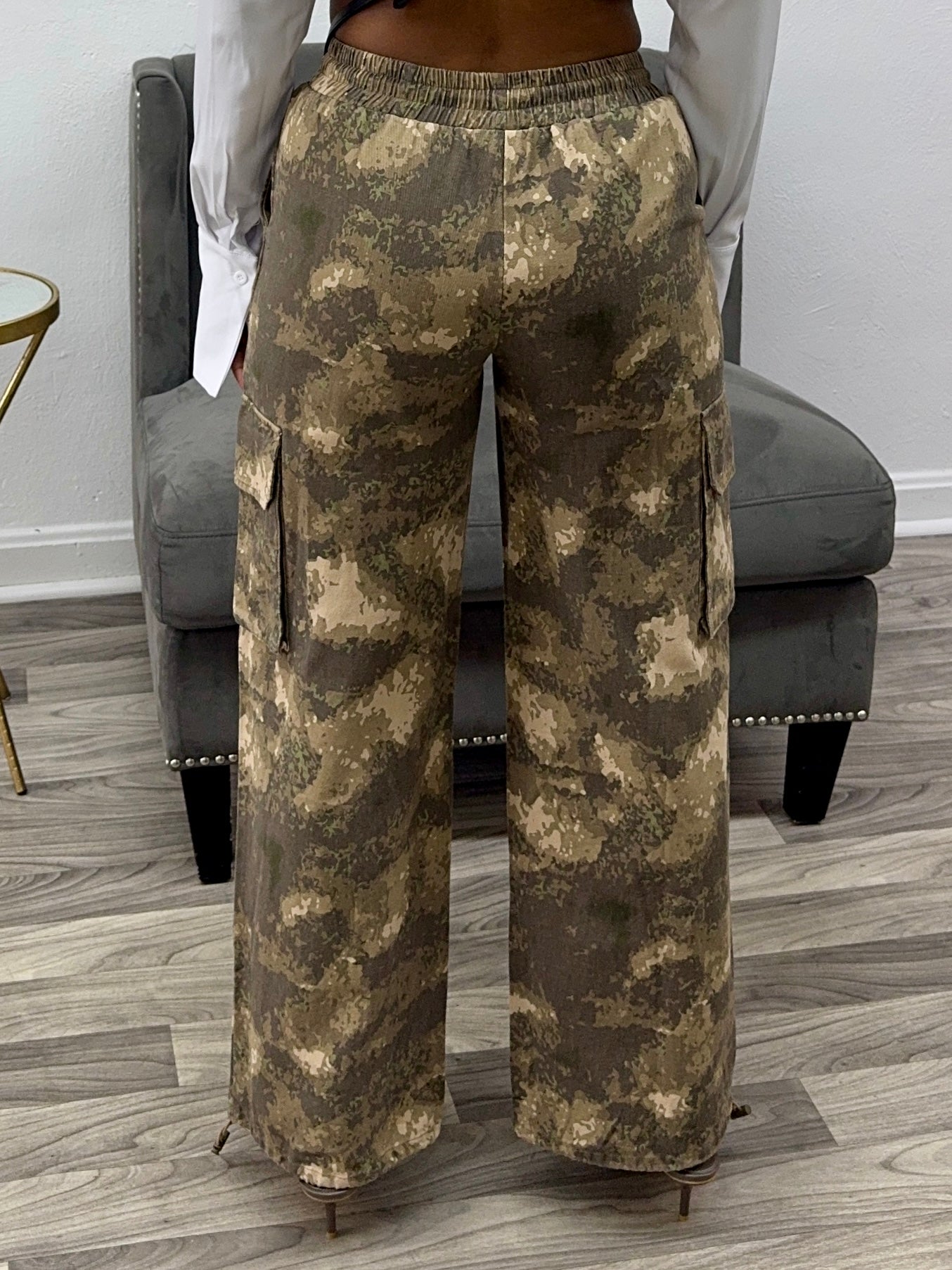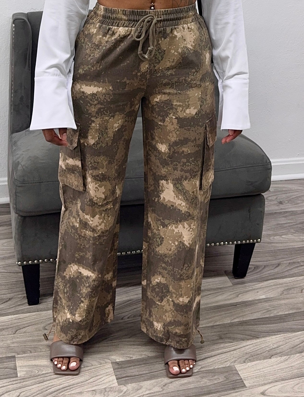 Nude cargo-style pants with a wide leg opening and no stretch. They feature ankle ties, providing the option to wear the jogger style. For optimal fit, it is recommended to go up one size. The model, 5’4” and 147lbs, is wearing a medium.