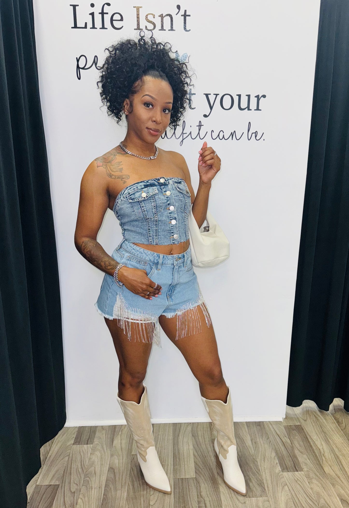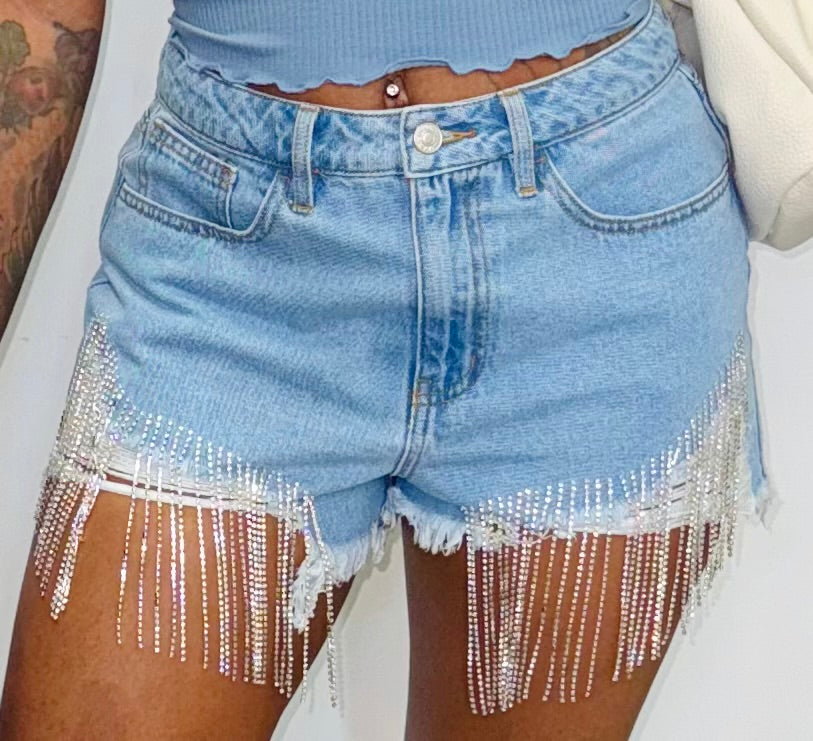 Destroyed Denim shorts with no stretch ft. Rhinestone tassels. Model is 5’4”, 140lbs wearing a size 28.