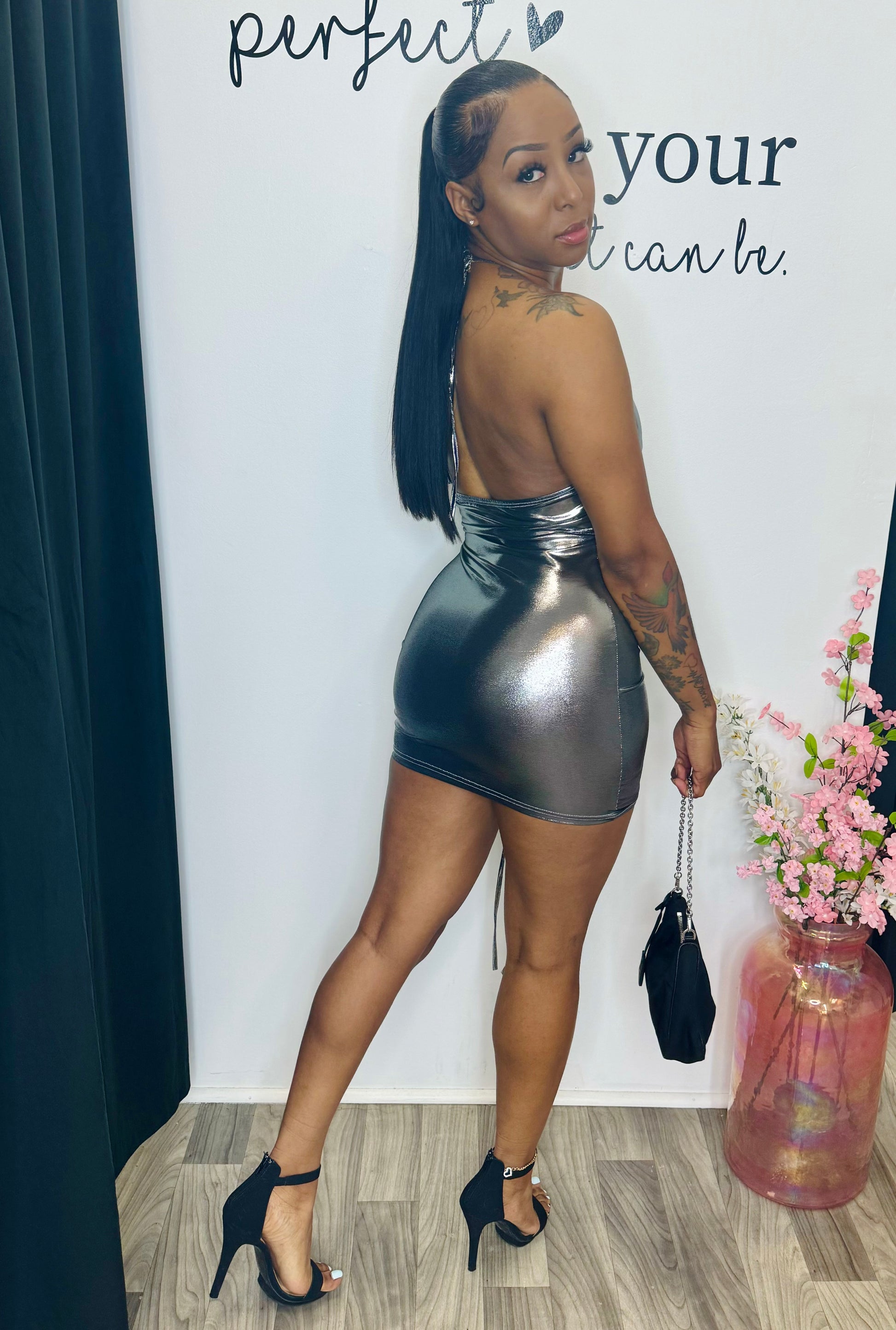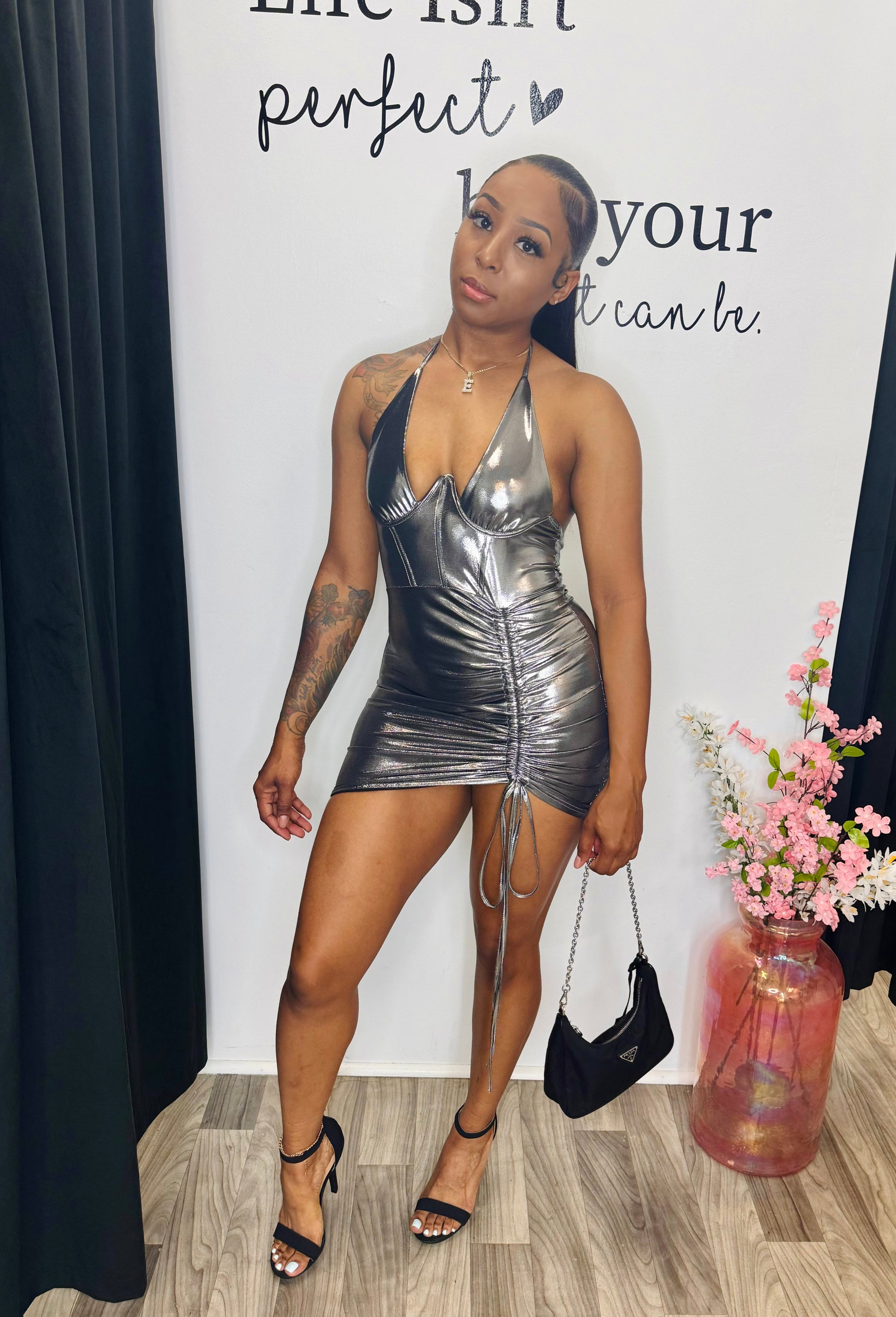 Ruched mini dress that can be adjusted. True to size with stretch, model is 5'4" 144lbs wearing a S.