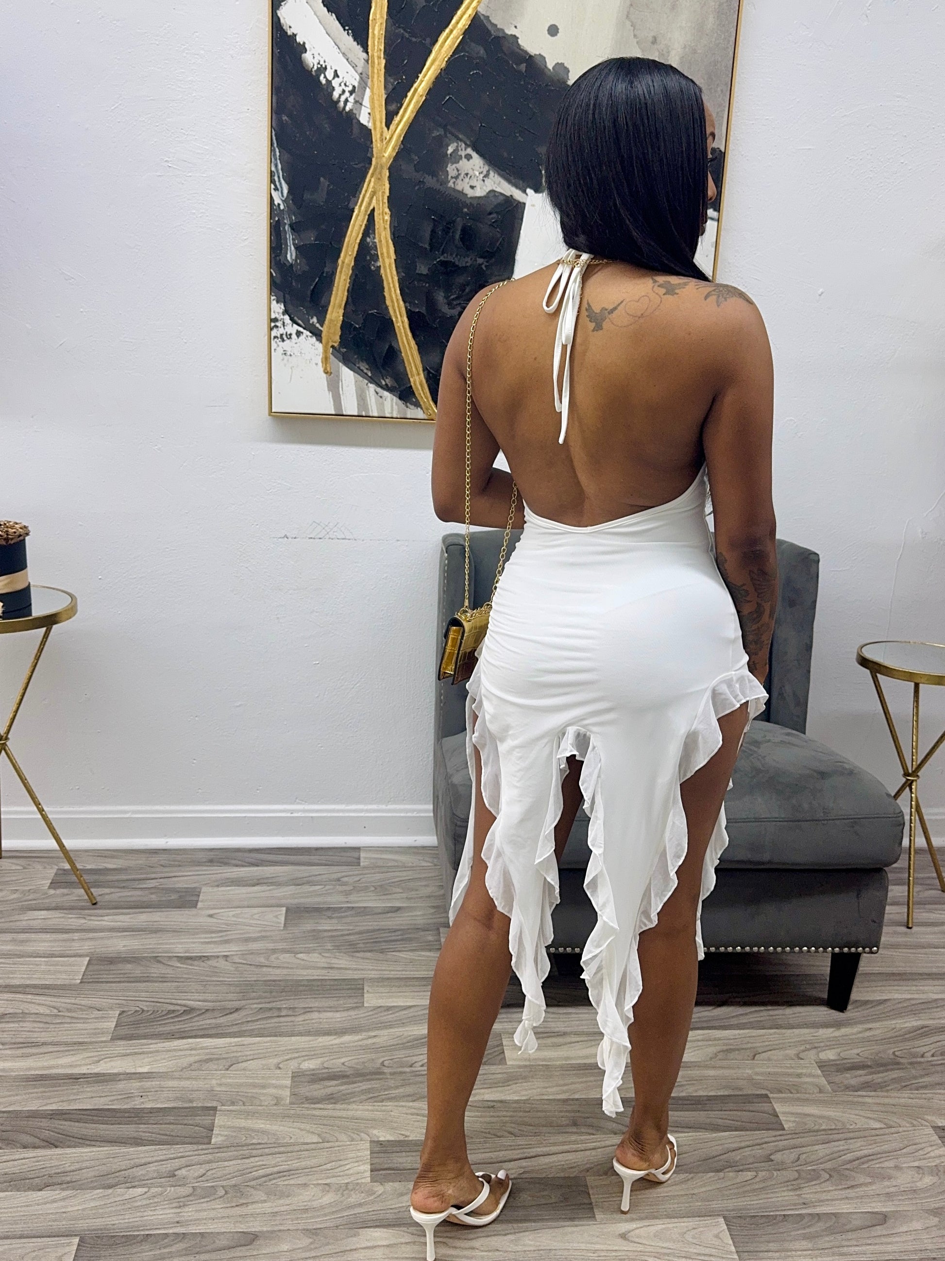 Crafted with a halter top and high split design, the Fairytale Dress offers a true to size fit with a comfortable stretch. The model pictured is 5'4" and weighs 140lbs, wearing a small size.