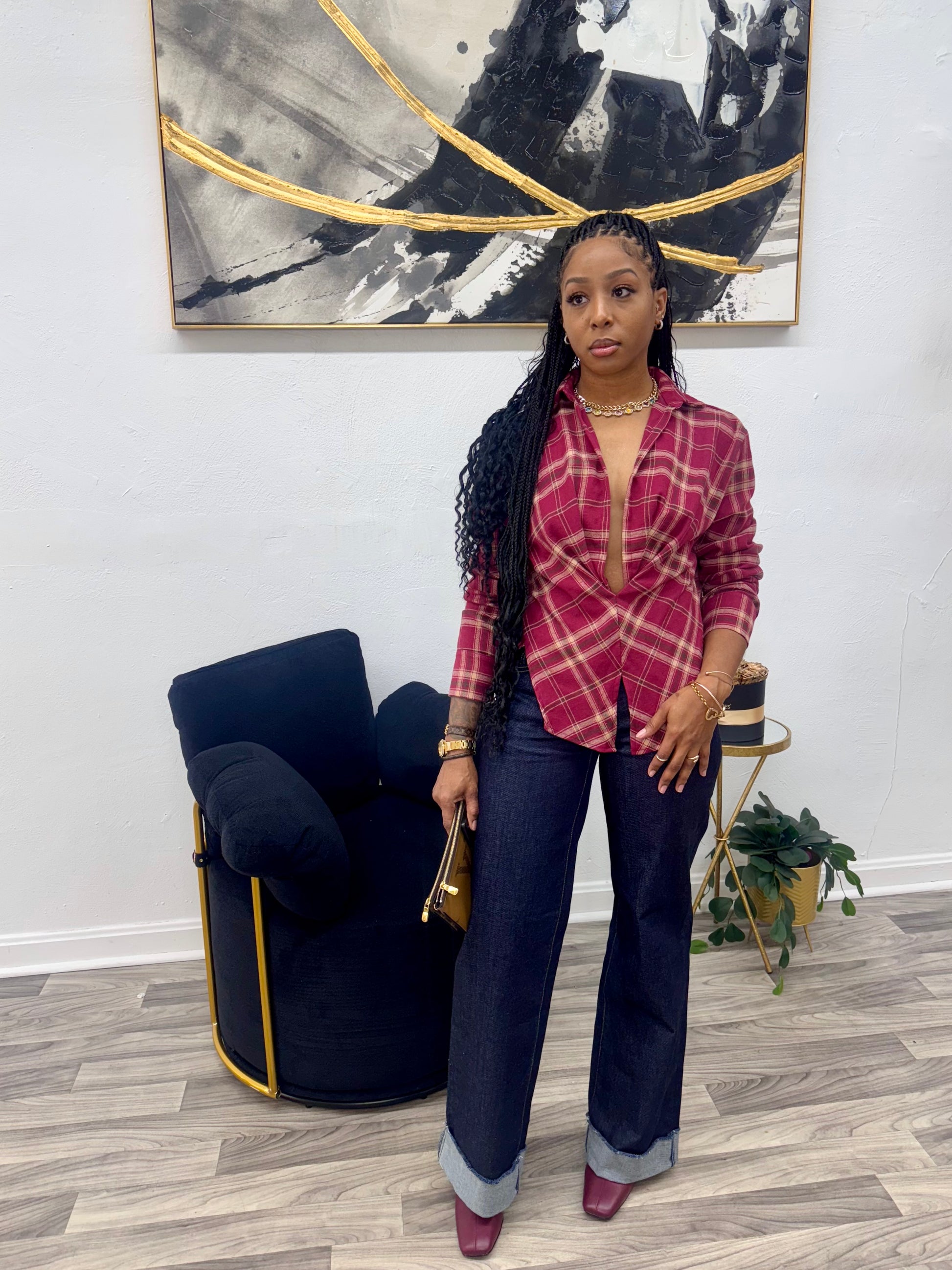 This top features a Deep V neckline, pull over design, and button closure on the sleeves. It has a relaxed fit without any stretch, while still maintaining its true-to-size fit. The model in the photo is 5’4” and weighs 140lbs, wearing a size small.