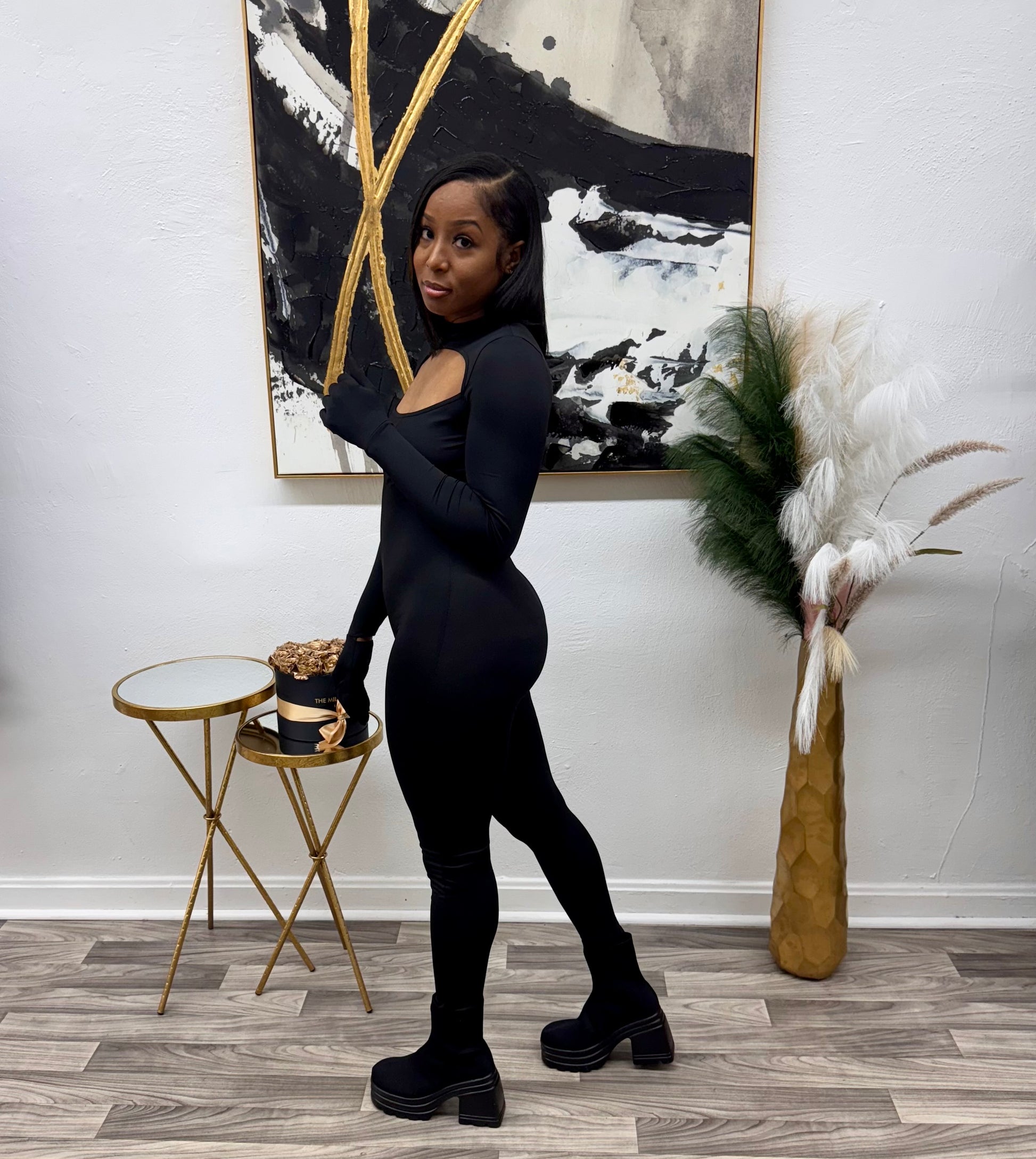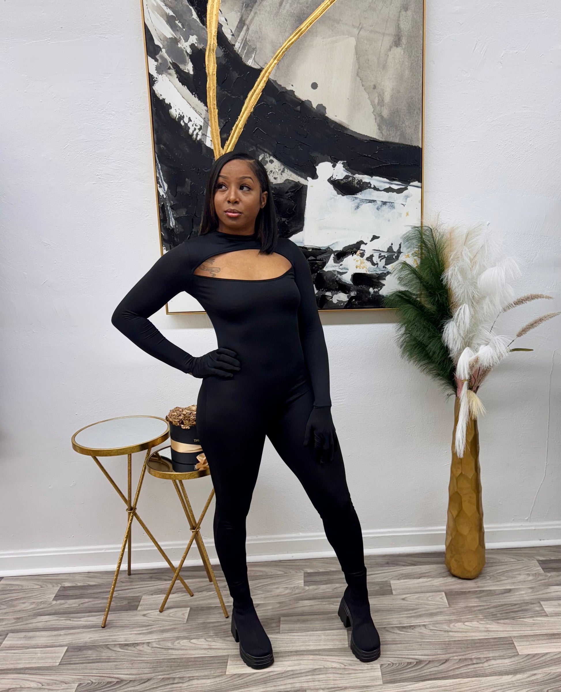 This jumpsuit features a zipper in the back for easy entry. It can be worn with or without gloves and is made from a stretchy material. The model wearing a size small is 5'4" and weighs 147lbs.