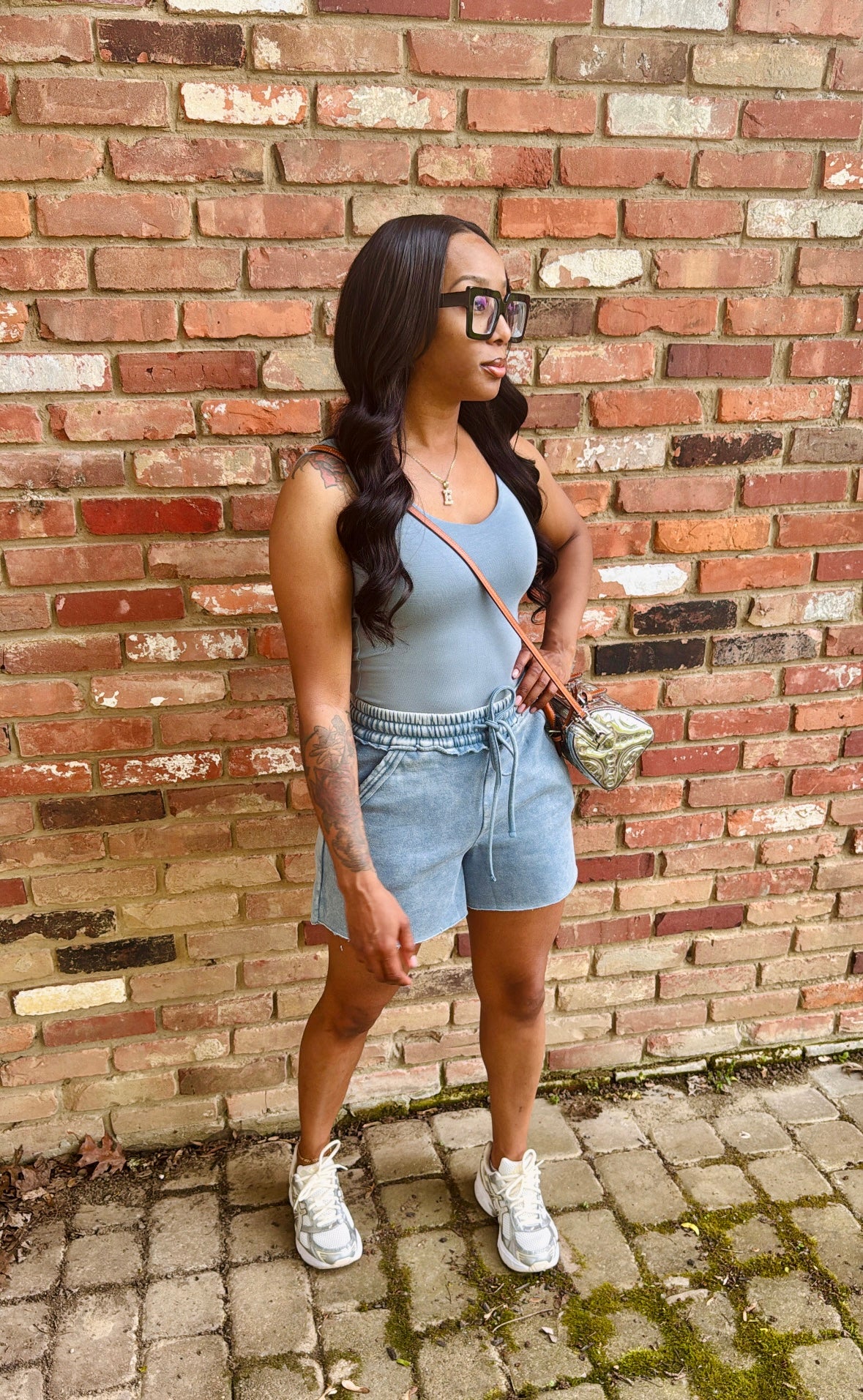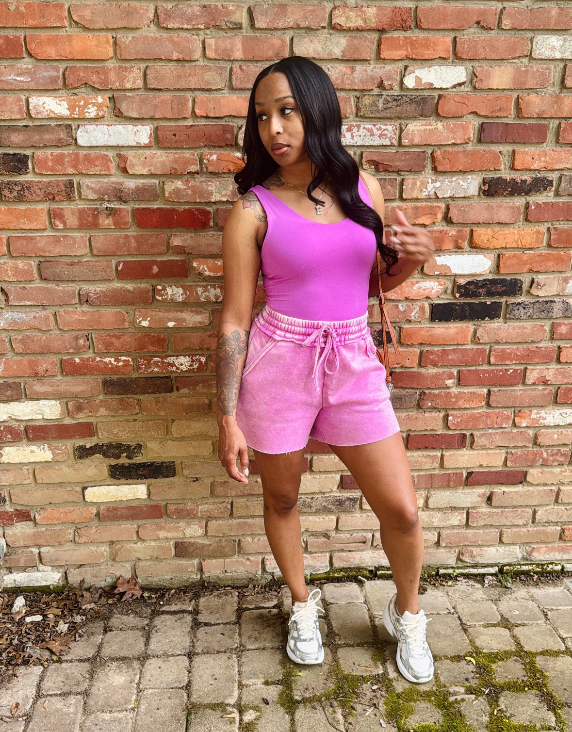 The Just another day set features a relaxed fit with a top that stops at the waist. The model, who is 5'4" and weighs 140 lbs, is seen wearing a size small in the product photos.