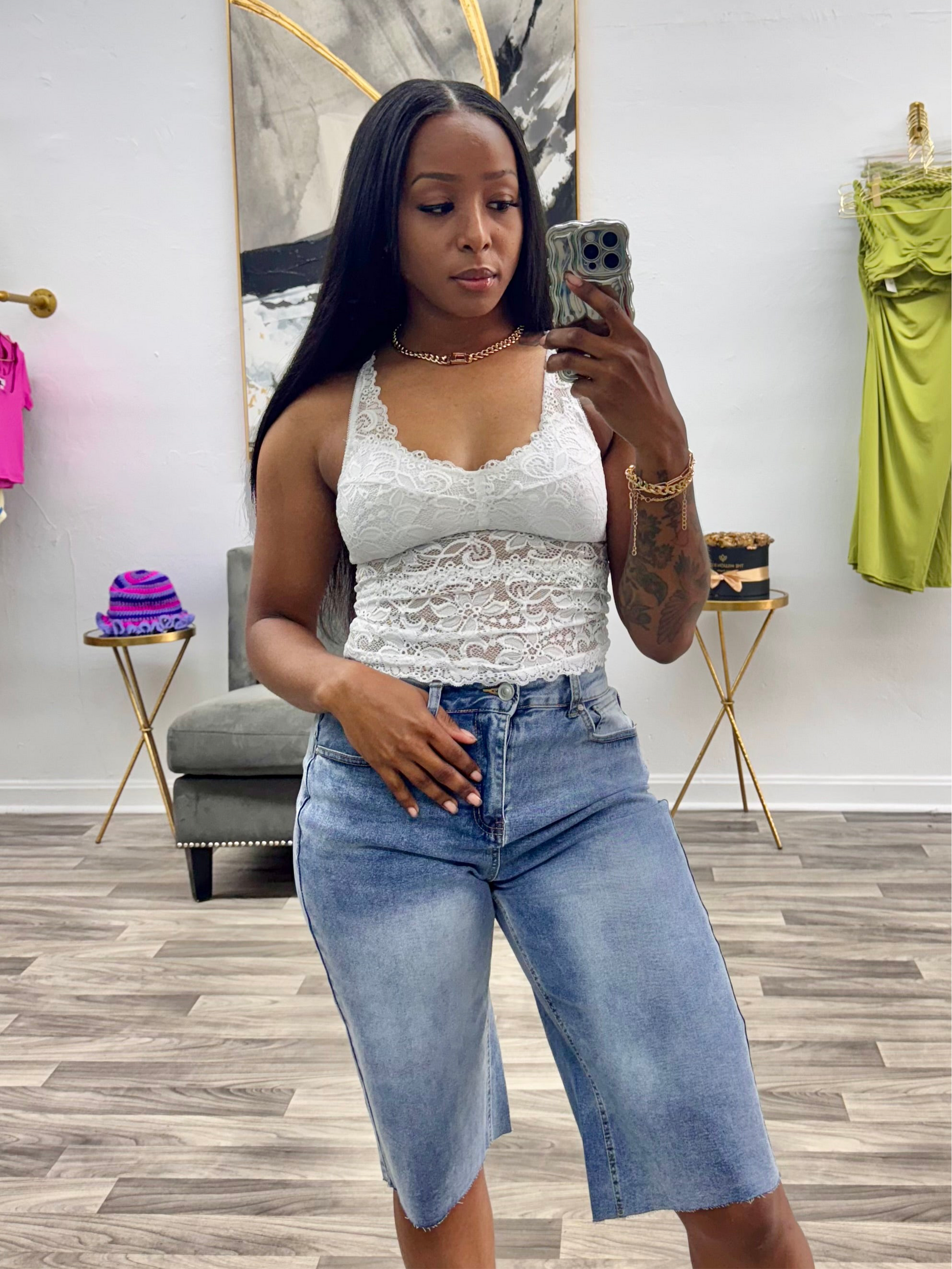 This lace top offers a stretchy fit that remains true to size. It includes padding in the chest area and adjustable straps for added comfort and support. The model which wear a A cup and a size small is wearing a S/M.