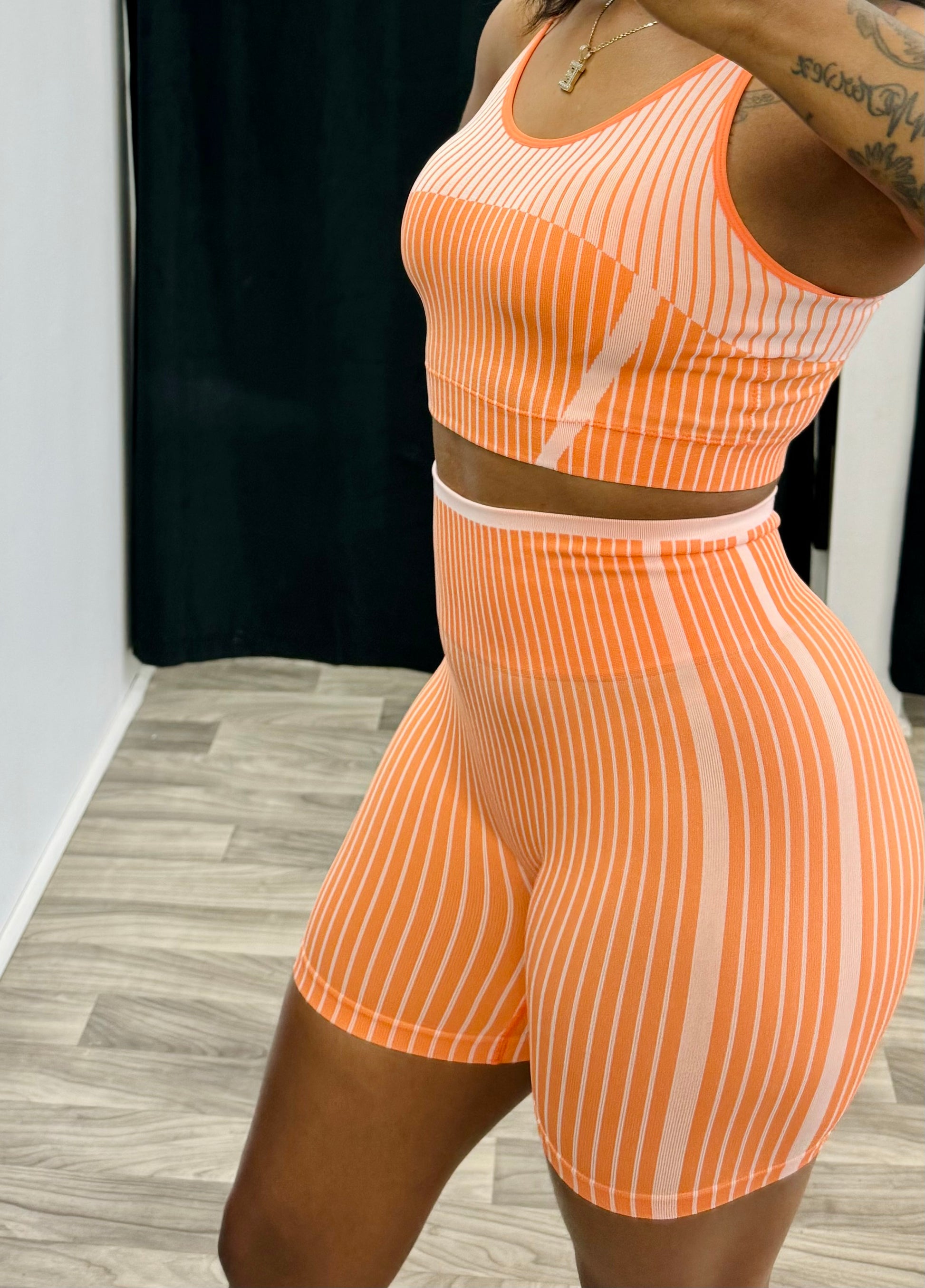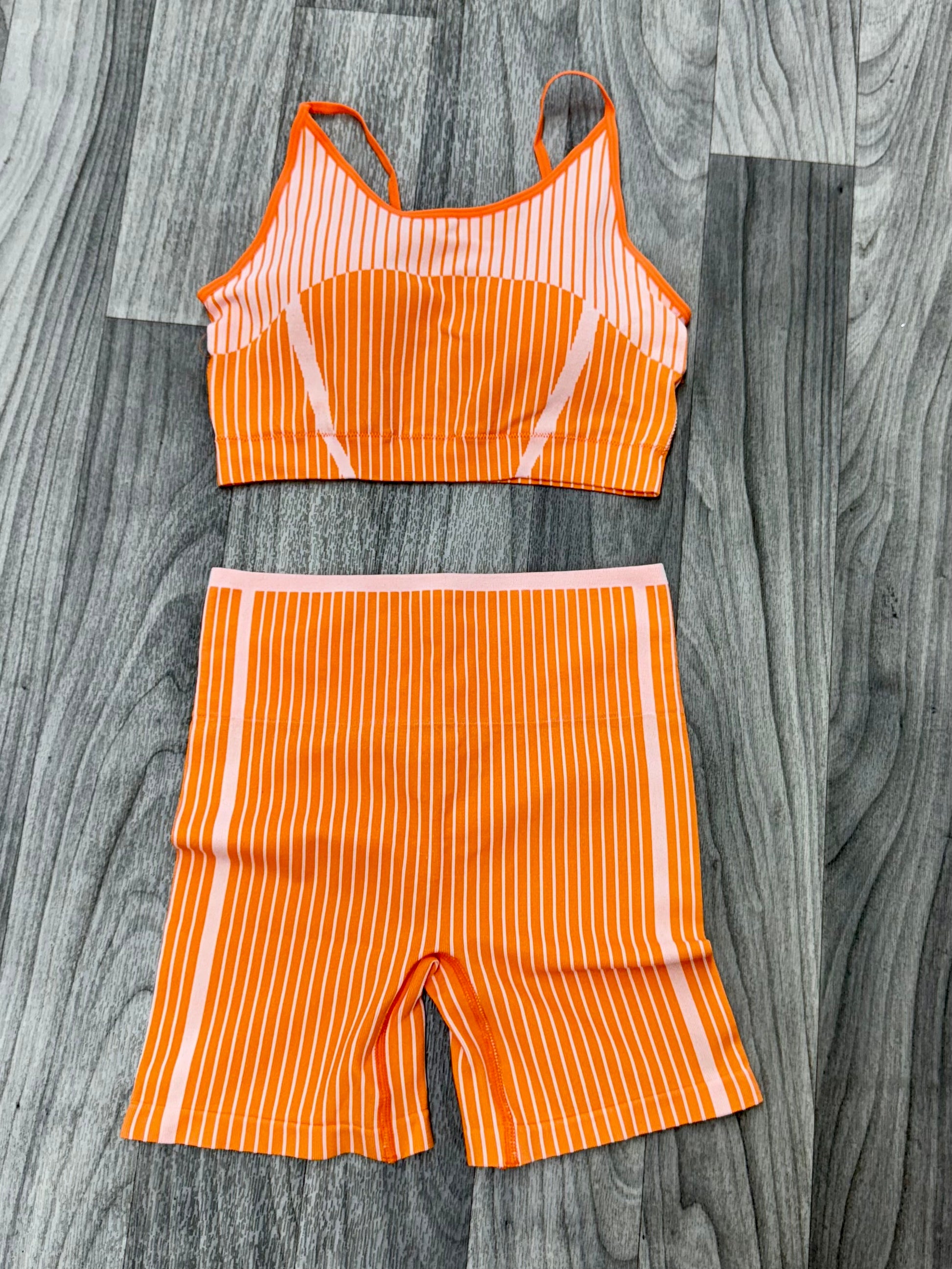 Seamless biker set. Includes breast padding that can be removed and bra straps are adjustable. Very stretchy, model is 5'4" 143lbs wearing a S/M.
