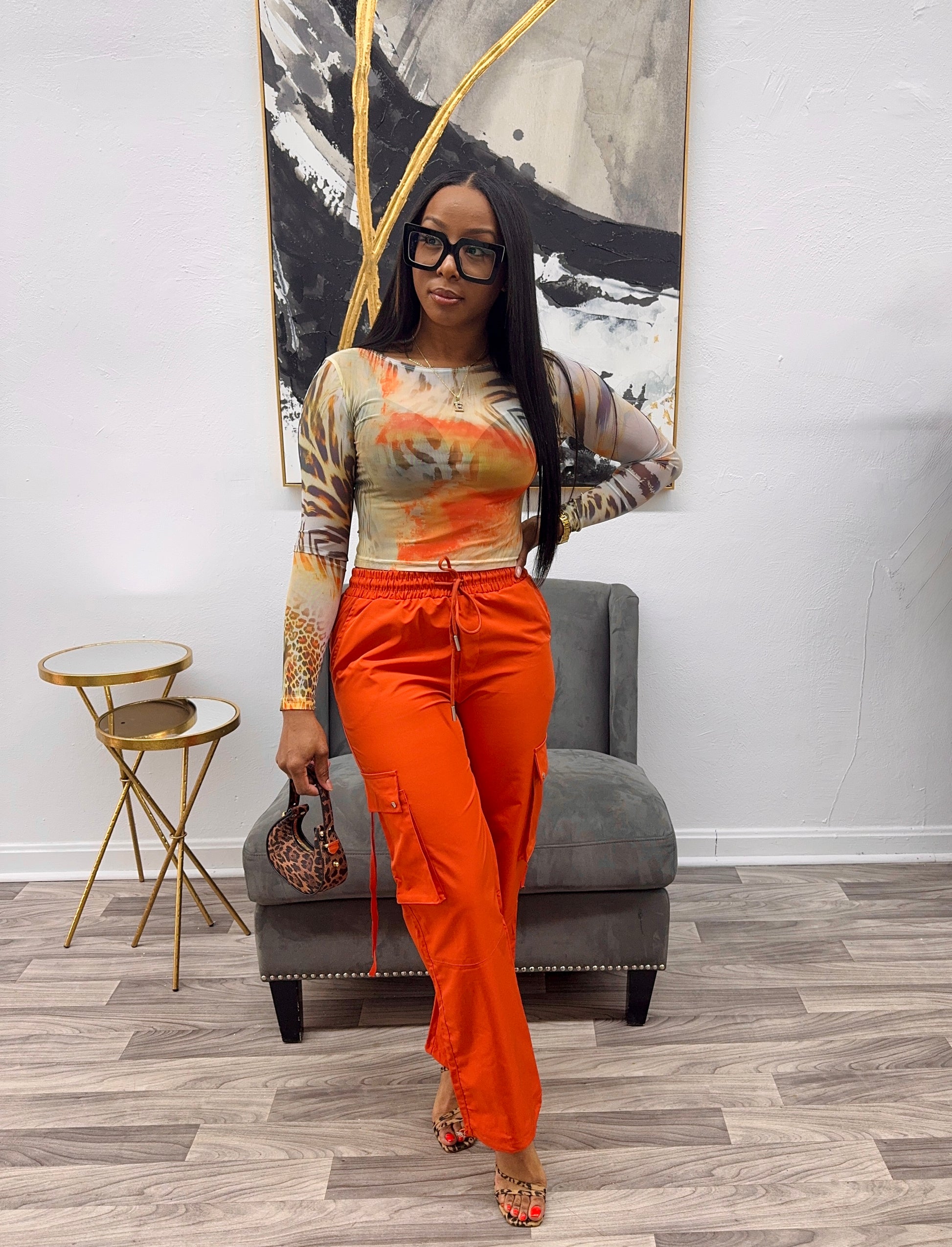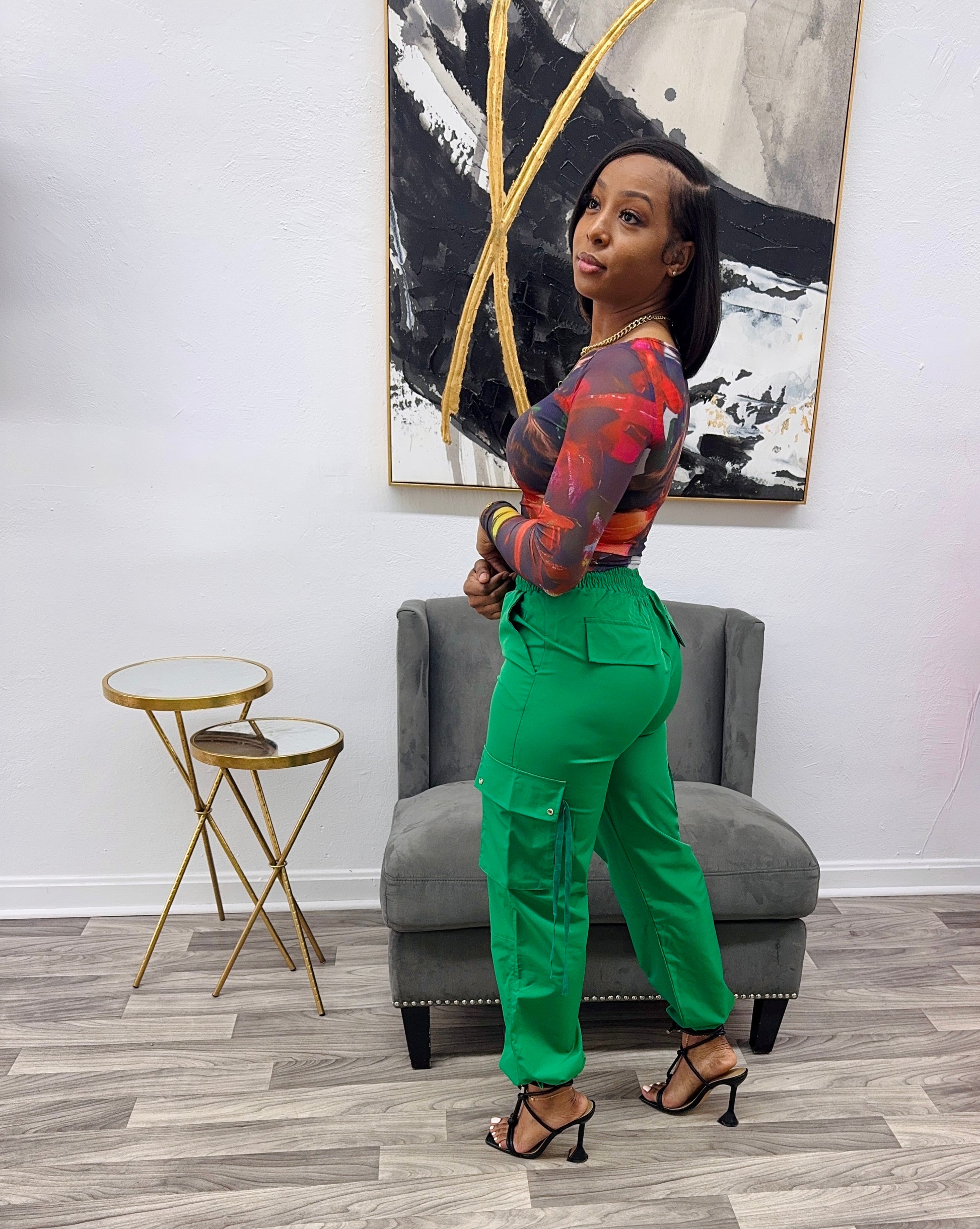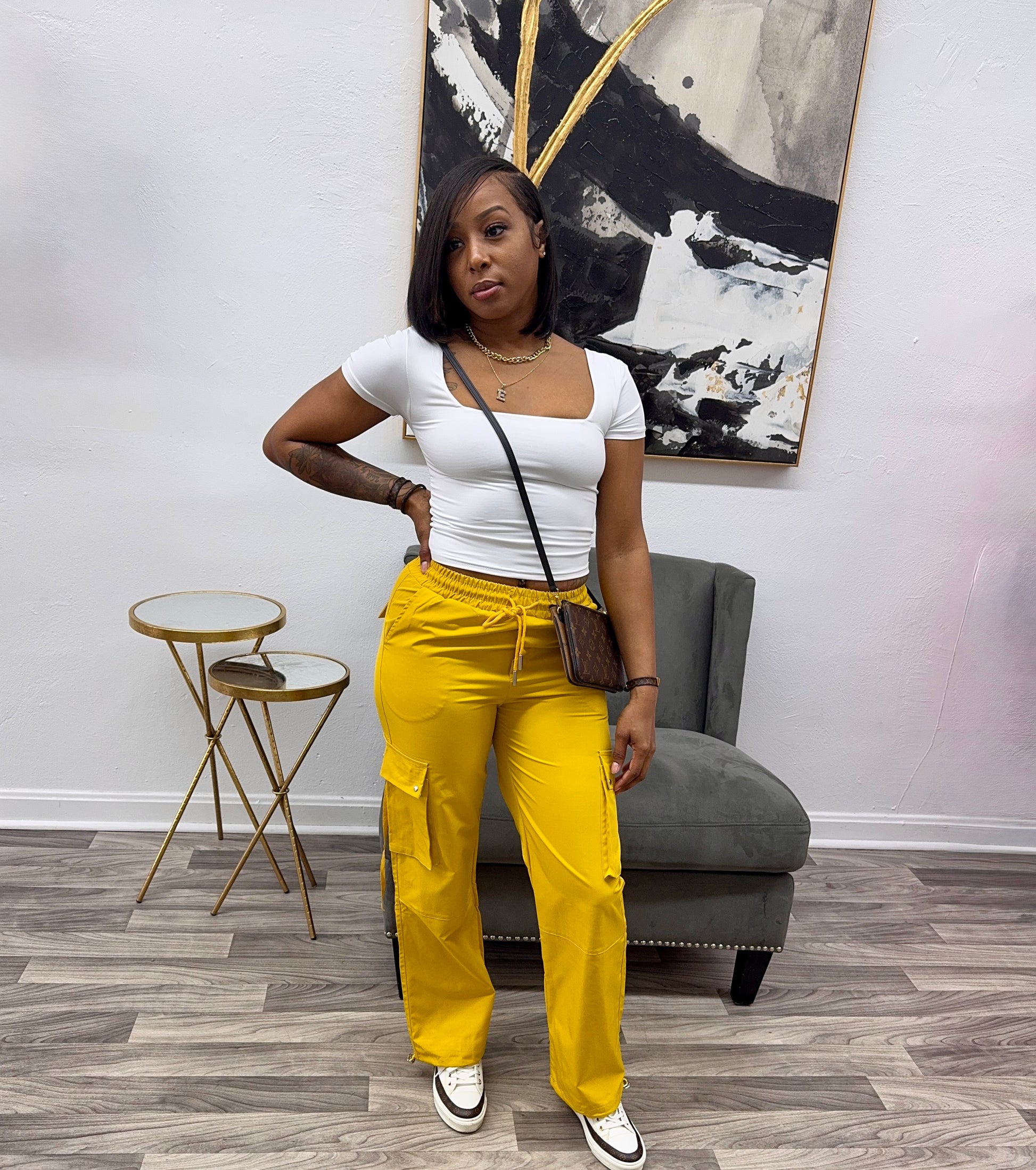 These pants are versatile as they can be worn as joggers by tying the ankle. They come with a 3D cargo pocket and can be worn high waist. They fit true to size, with no stretch and a model of 5’4” and 150lbs wearing a size small.