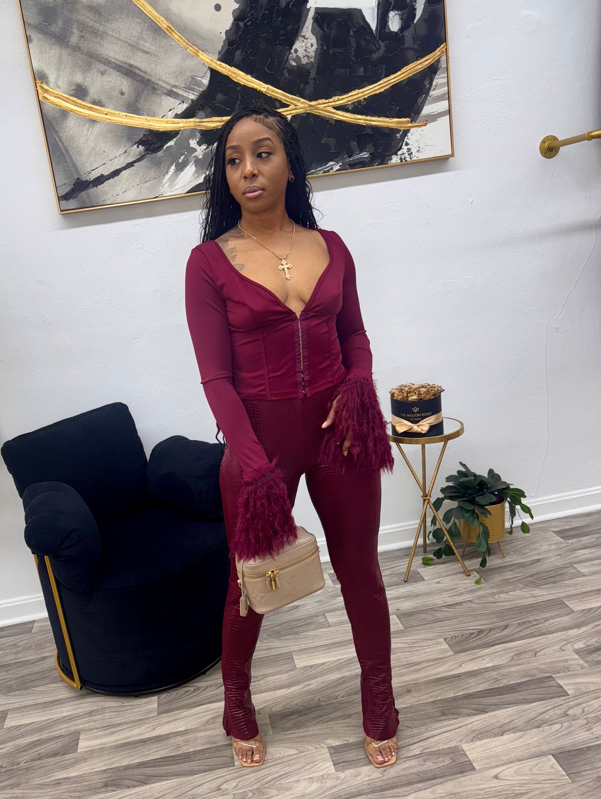 The Sugar & Spice Top features a stretchy design with a corset-like entry and feathered wrists. No padding is included for the bust. The model in the image is 5’4”, weighs 140lbs, and is wearing a size small.