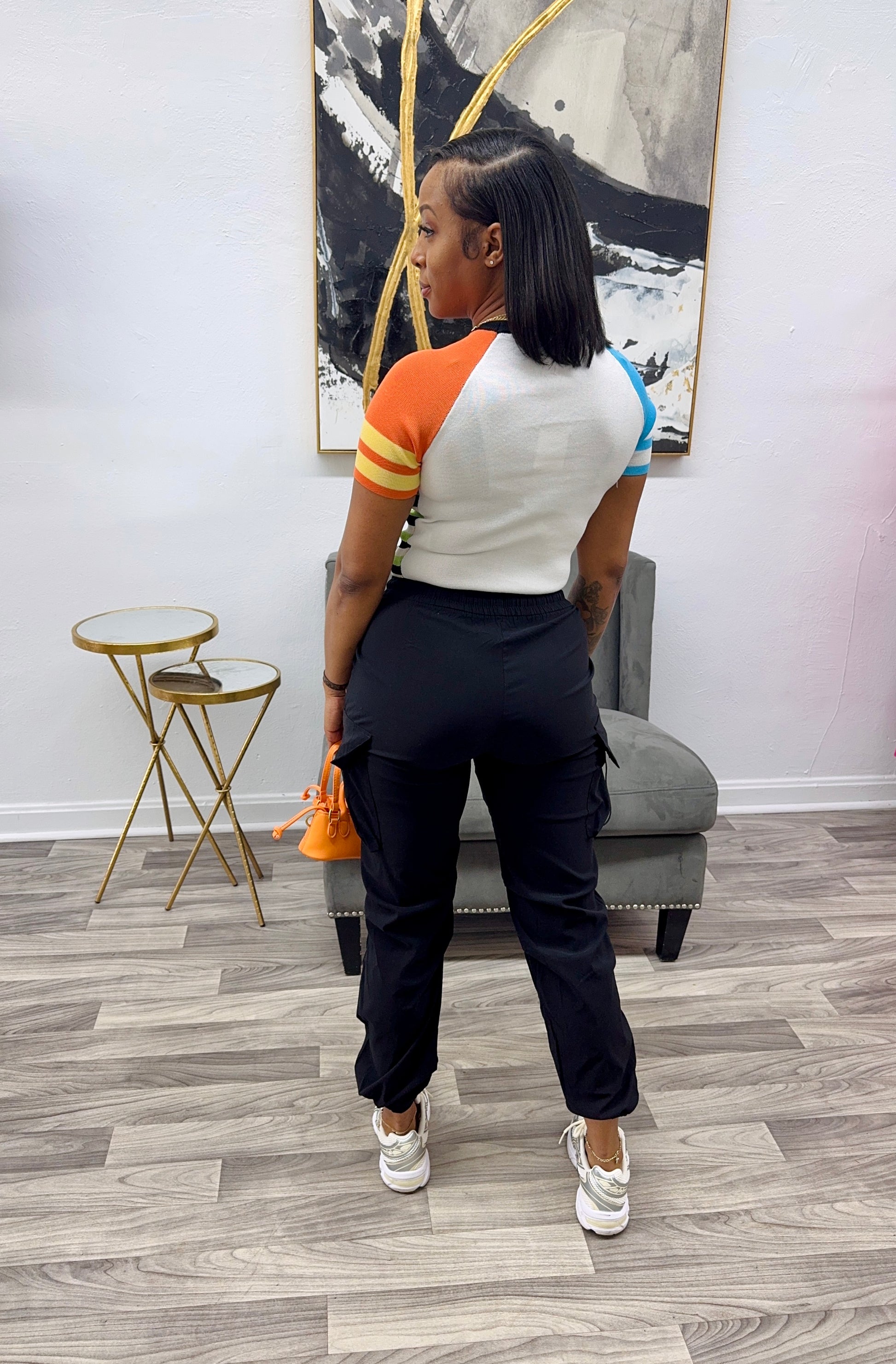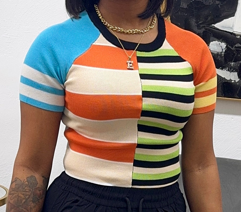 Slightly cropped top, has stretch and true to size. Model is wearing a size small.