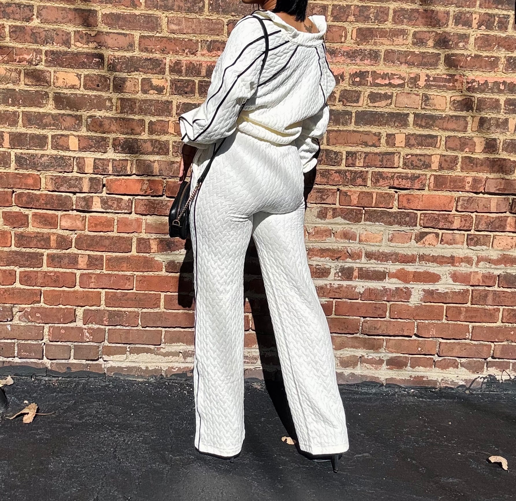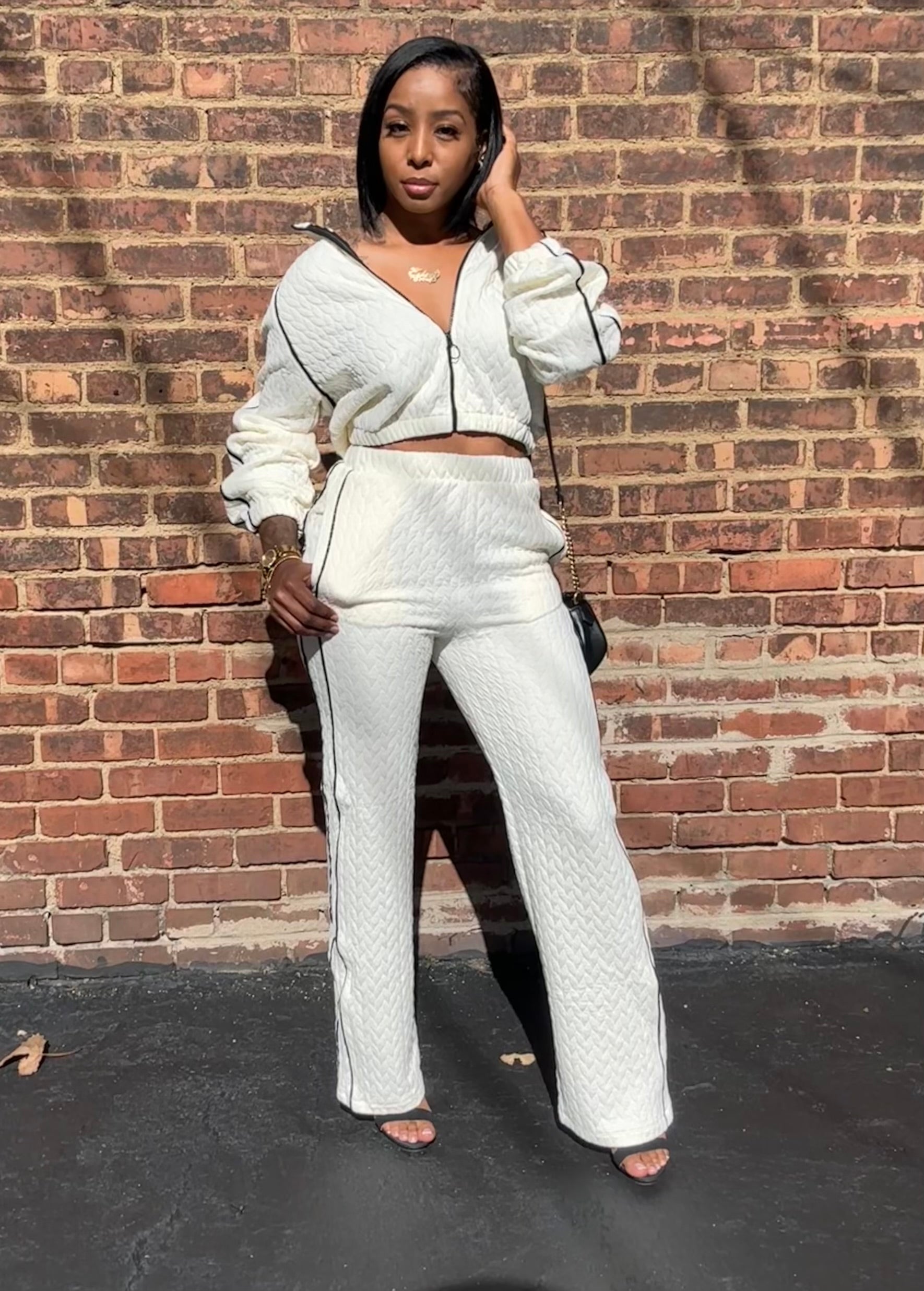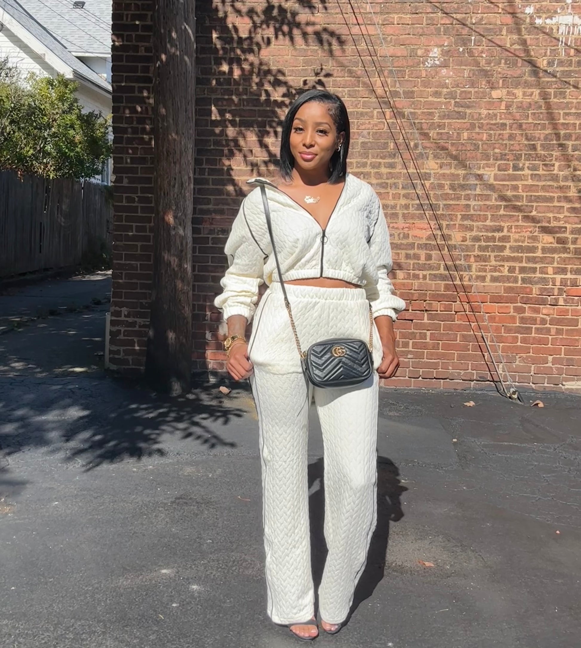 This versatile set can be paired with both heels and flats, providing both comfort and warmth due to its stretchy material. The waist-length jacket and high-waisted pants are suitable for tall women and are modeled by a 5'4", 143-pound woman wearing a size small.